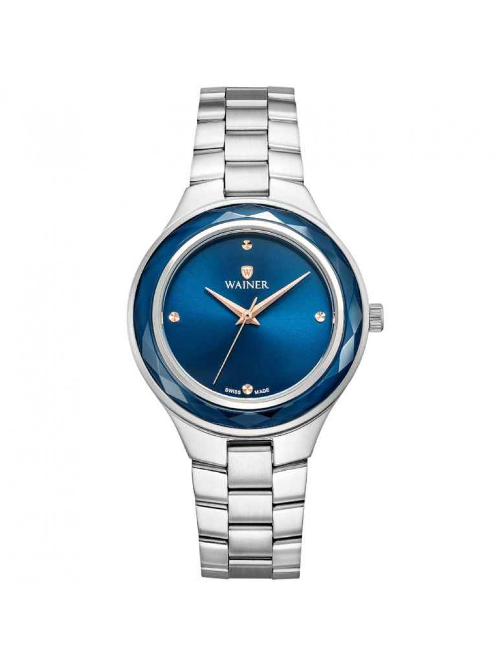 Швейцарские, наручные кварцевые часы WAINER. Синий циферблат. Корпус из нержавеющей стали. Минеральное стекло. На браслете.