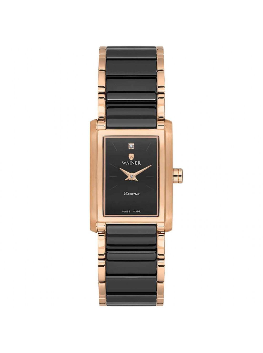 Швейцарские женские наручные кварцевые часы WAINER. Черный циферблат. Корпус из нержавеющей стали с PVD покрытием. Сапфировое стекло. На браслете сталь/керамика.