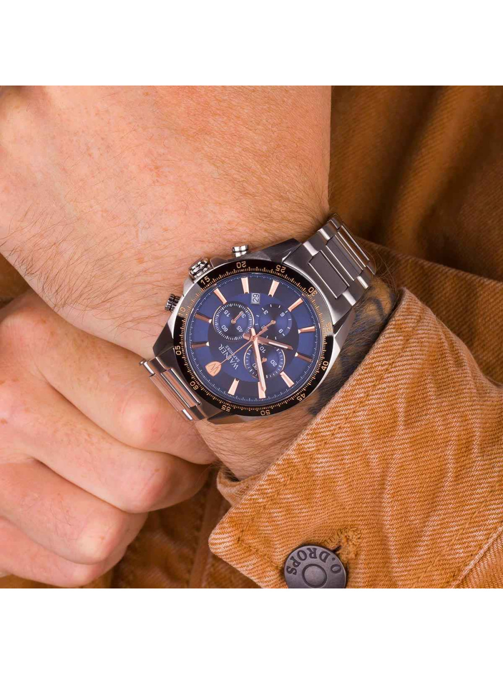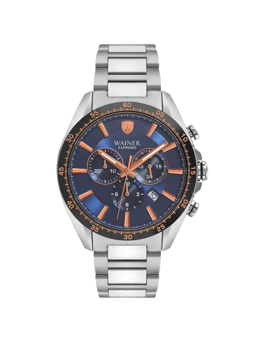 Швейцарские, наручные кварцевые часы WAINER. Корпус из нержавеющей стали. Дата, хронограф, люминесцентные стрелки. Сапфировое стекло. На браслете.