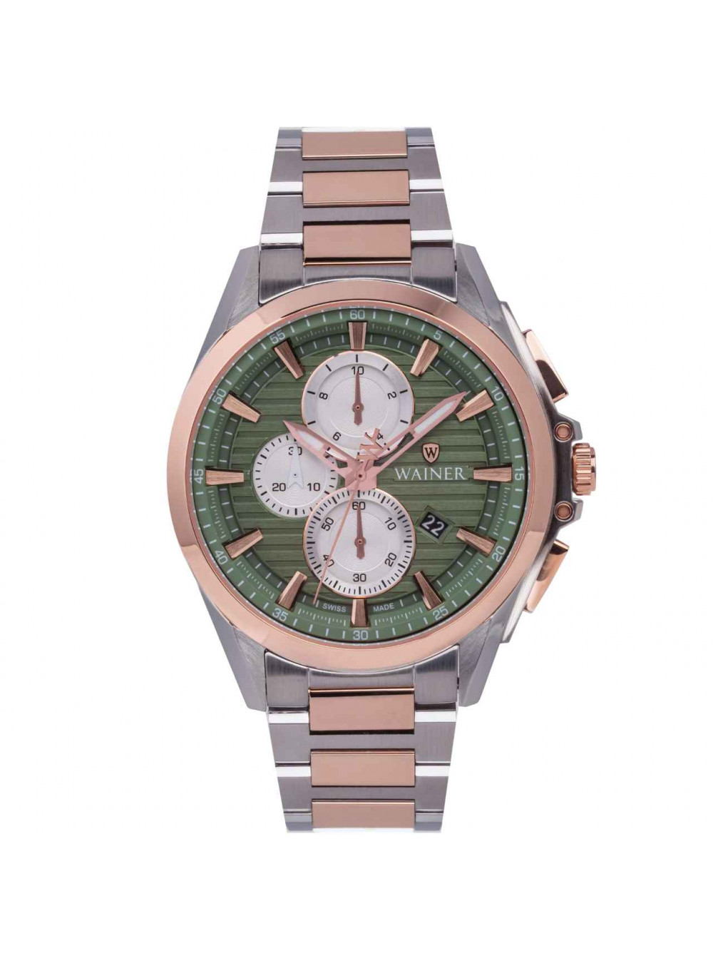 Швейцарские, наручные кварцевые часы WAINER. Корпус из нержавеющей стали c PVD покрытием. Дата, хронограф. Сапфировое стекло. На браслете.