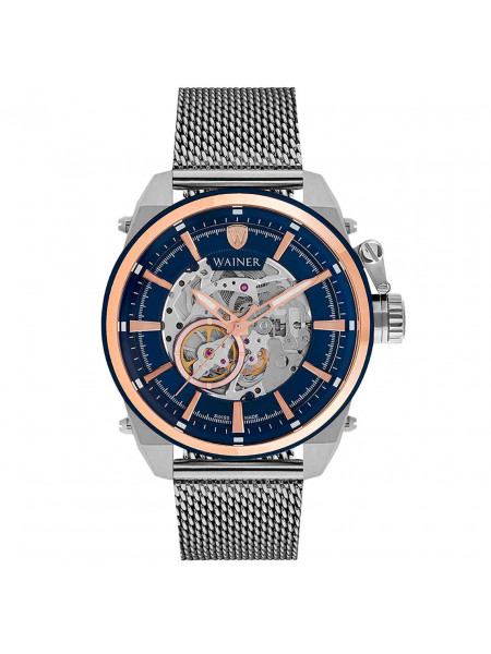 Швейцарские, наручные, механические с автоподзаводом часы WAINER. Корпус из нержавеющей стали c PVD покрытием. Скелетон, прозрачная задняя крышка, люминесцентные стрелки. Сапфировое стекло. На браслете.