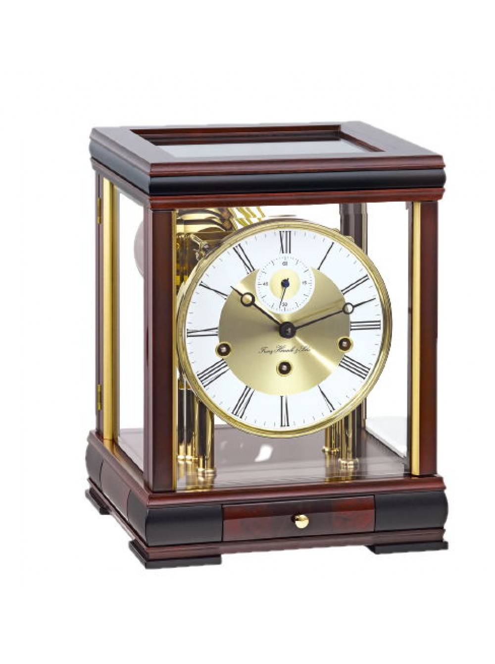 Классическая коллекция Hermle - элегантные настольные часы из полированного массива вишни. Материал корпуса - дерево. Цвет - орех. Размер 25*30*21 см. Оригинальный дизайн позволяет наблюдать высочайшее качество используемых материалов и работу механизма с любой стороны. Отдельный ящичек для хранения ключа. Механика с подзаводом на 8 дней. Бой каждый час по количеству полных часов, мелодия каждую четверть часа. Регулятор - анкерный ход. Автоматическое отключение боя и мелодии на ночь.