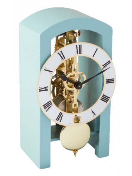 Современные дизайнерские настольные механические часы HERMLE с корпусом из дерева. Цвет корпуса - голубой. Размер 18*9*11 см. Длительность завода 14 дней. Регулятор - маятник. Механизм - скелетон