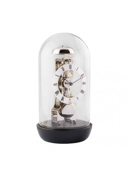 Современные настольные механические часы HERMLE с цоколем из массива дерева. Цвет - черный. Размер 30*Ф15,5 см. Длительность завода 14 дней. Один удар в колокол каждый час. Регулятор - маятник. Механизм - скелетон