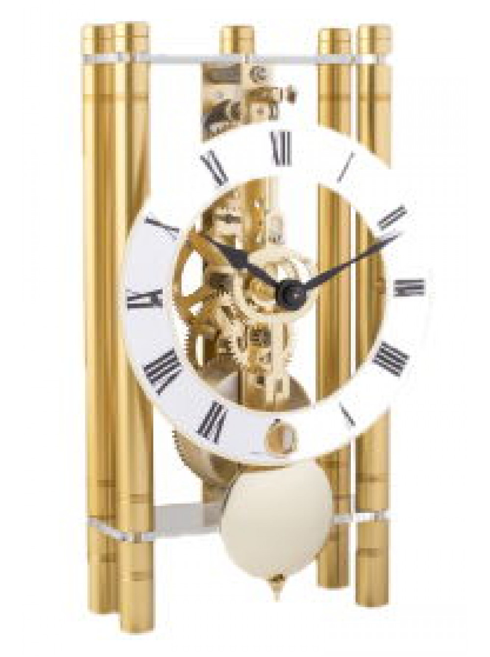 Настольные механические часы HERMLE. Материал корпуса - латунь. Цвет - желтый. Размер 19,5*11*6 см. Современные дизайнерские механические настольные часы с металлическим корпусом. Длительность завода до 8 дней. Регулятор - маятник. Механизм - скелетон.