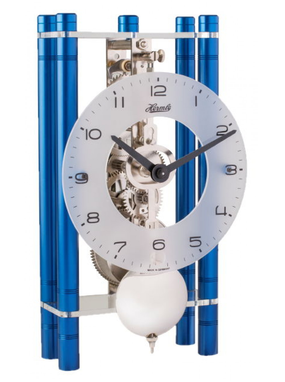 Настольные механические часы HERMLE. Материал корпуса - латунь, стекло. Цвет - синий. Размер 19,5*11*6 см. Современные дизайнерские механические настольные часы с металлическим корпусом. Длительность завода до 8 дней. Регулятор - маятник. Механизм - скелетон.