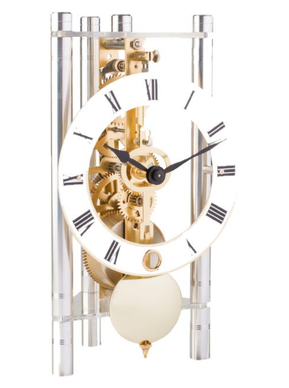 Механические настольные часы HERMLE. Материал корпуса - латунь, стекло. Расцветка - сталь. Размер: 19,5x11x9 см. Современные дизайнерские механические настольные часы с металлическим корпусом. Длительность завода до 8 дней. Регулятор - маятник. Механизм - скелетон.